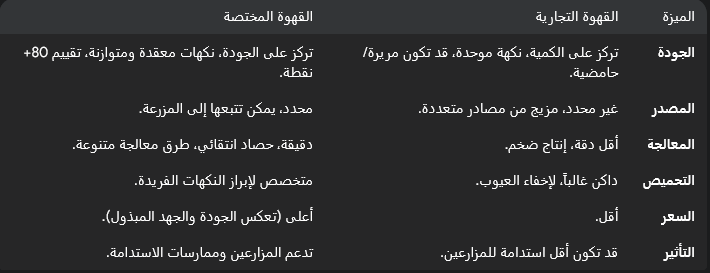- السعر: تكون أسعارها عادةً أقل بكثير من القهوة المختصة، مما يجعلها في متناول الجميع.
